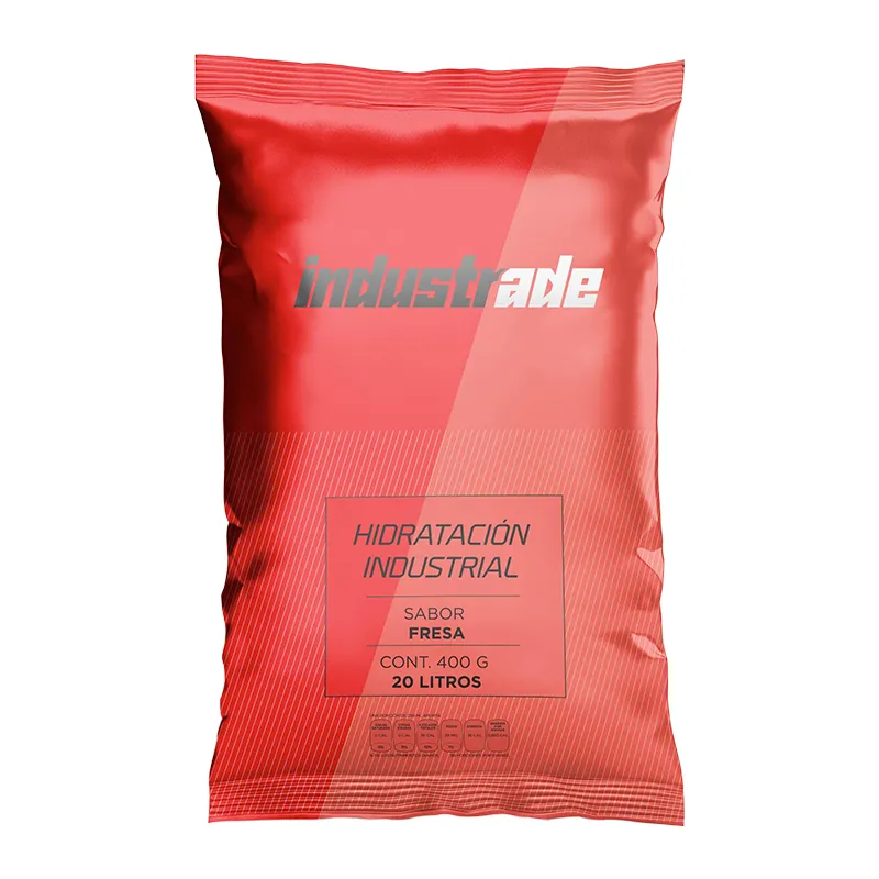 Industrade presenta su sobre de bebida hidratante sabor fresa con azúcar, formulado para preparar 20 litros de bebida rehidratante. Su mezcla con electrolitos y glucosa aporta una solución efectiva para ambientes exigentes.